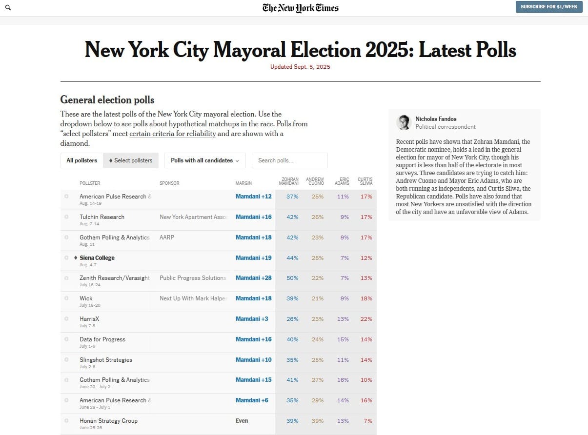 Current context: Public polling averages from the past 90 days show Zohran Mamdani leading with 41% support in a multi-candidate field, Andrew Cuomo at 24%, Curtis Sliwa at 16%, Eric Adams at 9%, and 10% undecided. Head-to-head matchups average to a tie at 41.5% each. The ballot is set with Mamdani (Dem), Cuomo (Ind), Sliwa (Rep), and Adams (Ind); Jim Walden withdrew on September 2. Mamdani has hit the $8M public matching funds cap, indicating strong fundraising, while CFB approved pre-general funds on August 28 without denials. Voter concerns center on affordability (64-74%), housing, and safety.