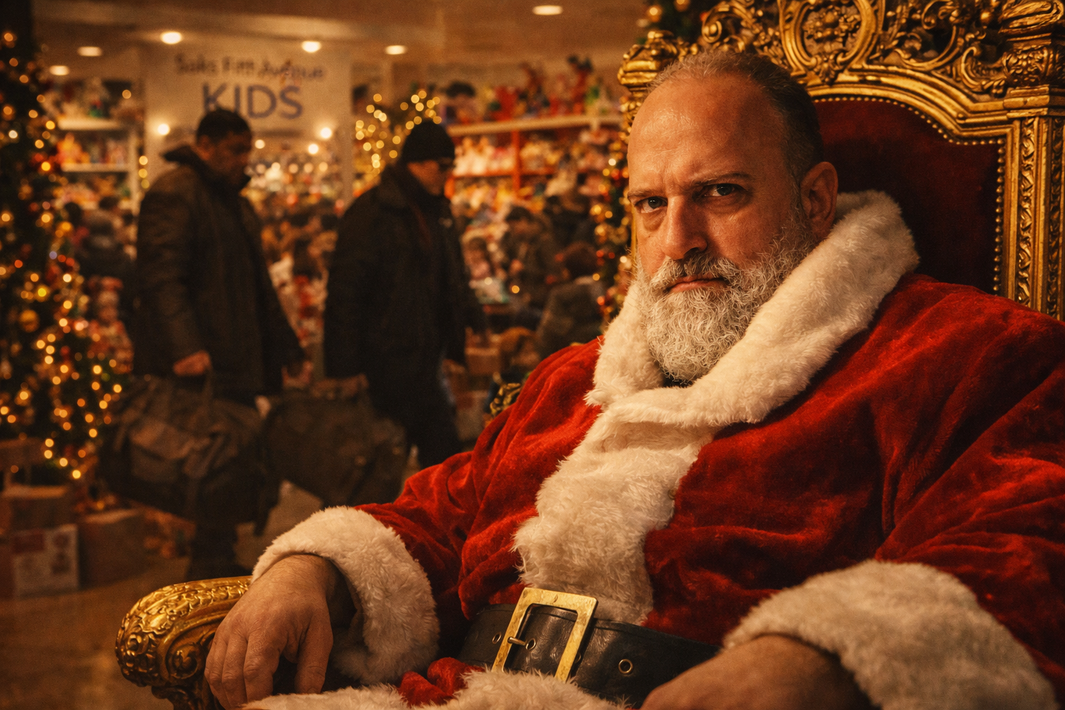 Two guys. Late twenties. Wrong energy for Saks on Christmas Eve. Everyone else is performing happiness, the aggressive consumption as a spiritual practice that keeps capitalism humming. These two are scanning exits.