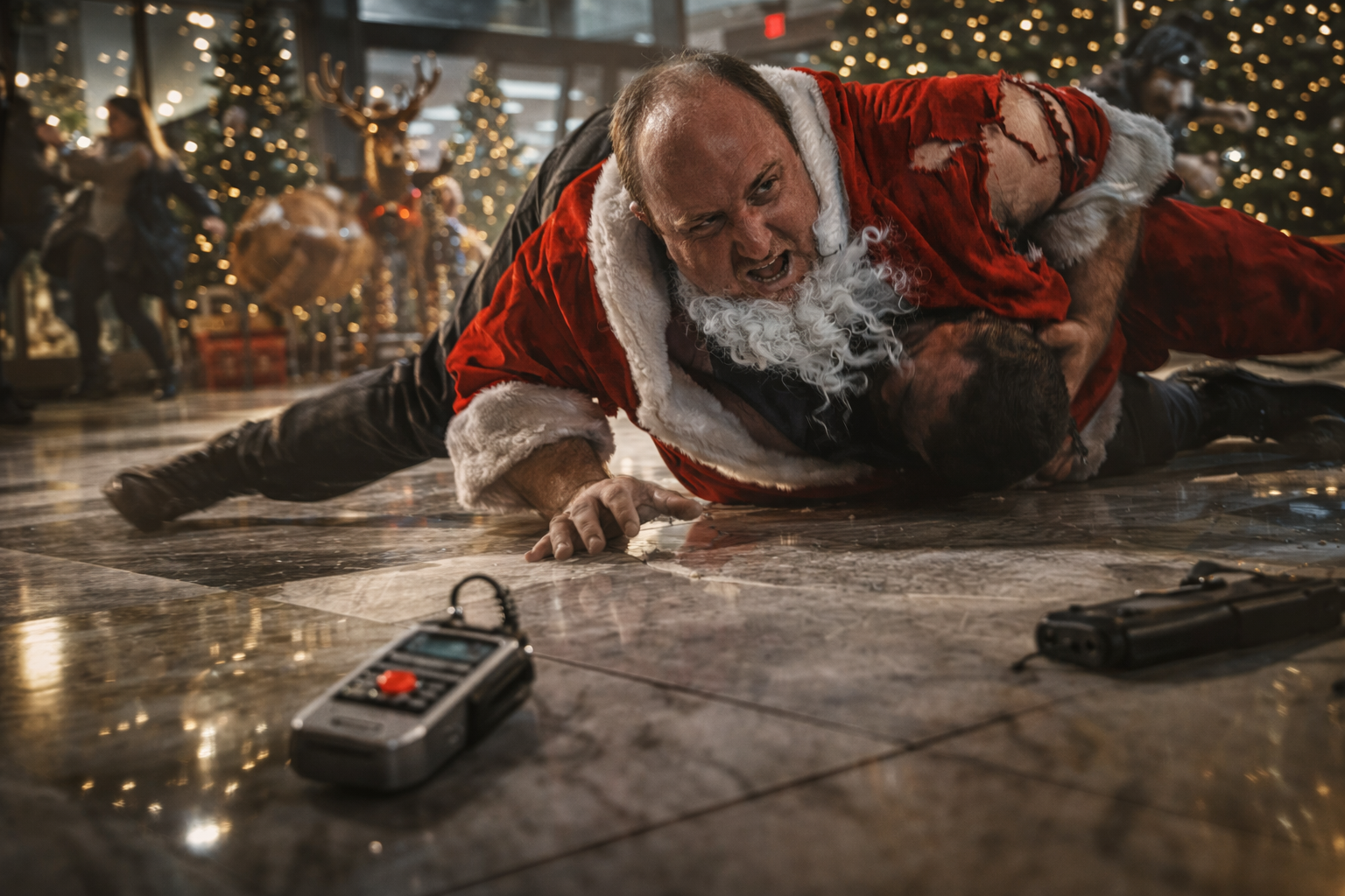 He follows the duffel bag guy. Stays twenty feet back. Watches. Waits for the moment this turns out to be a misunderstanding. Maybe it's camera equipment. Maybe it's a flash mob proposal. Maybe Jason's PTSD is acting up, and he's about to ruin someone's wholesome Christmas surprise.
