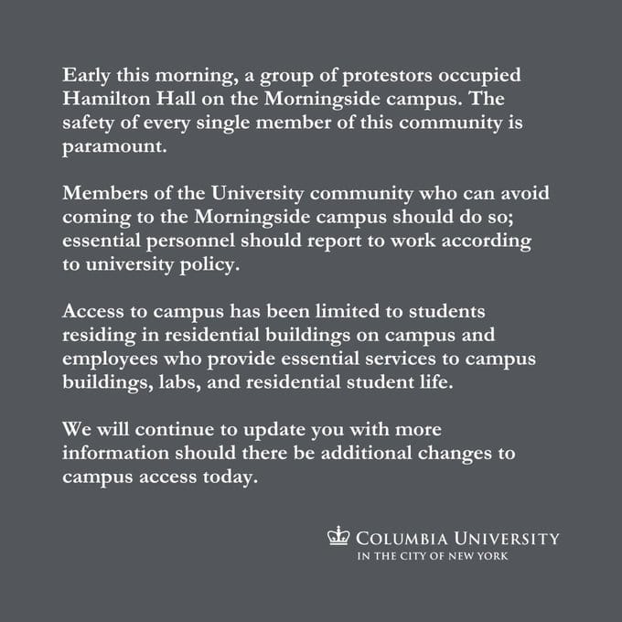Masked students are now breaking into the Hamilton Hall at Columbia University, occupying the building.