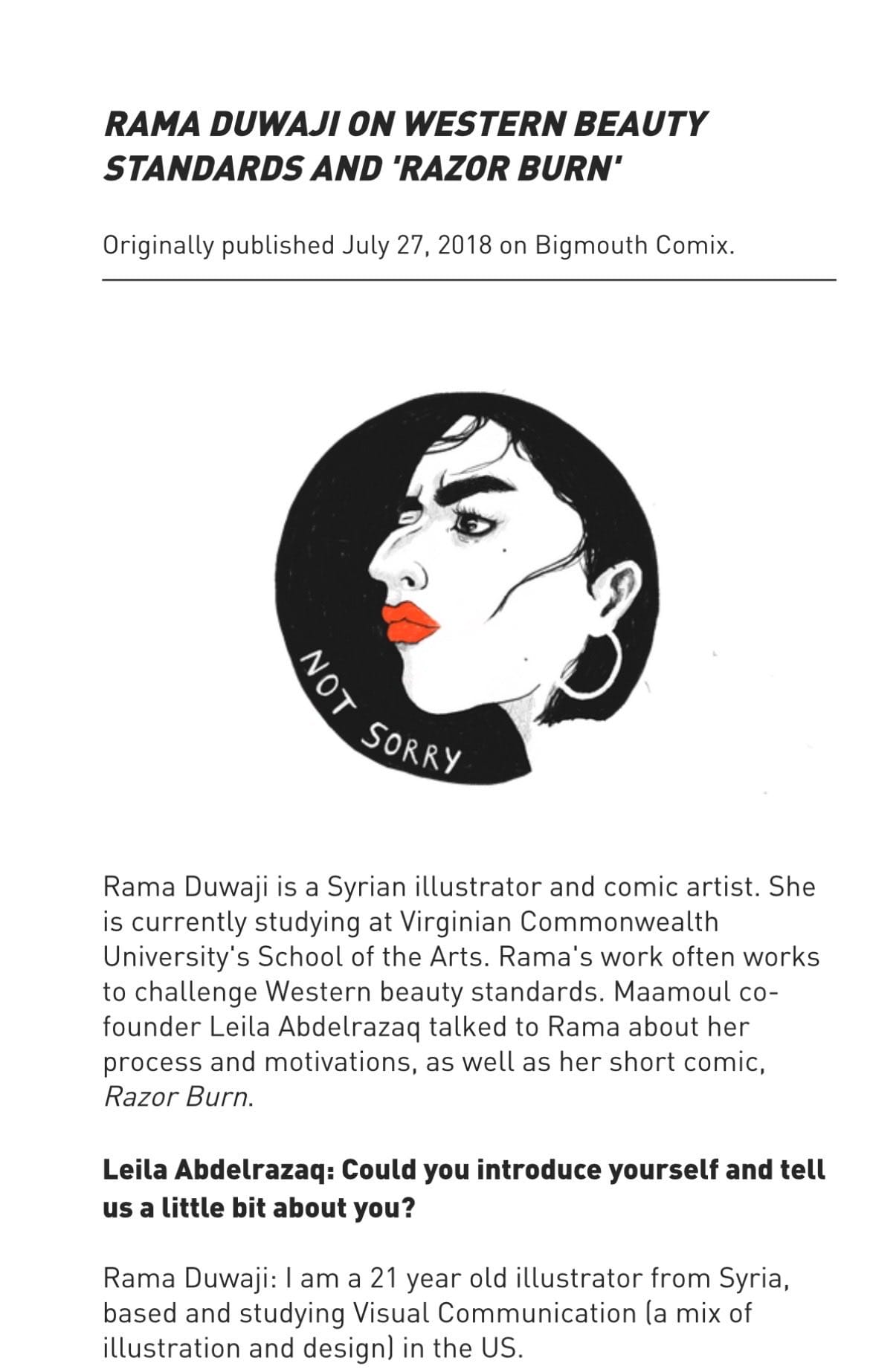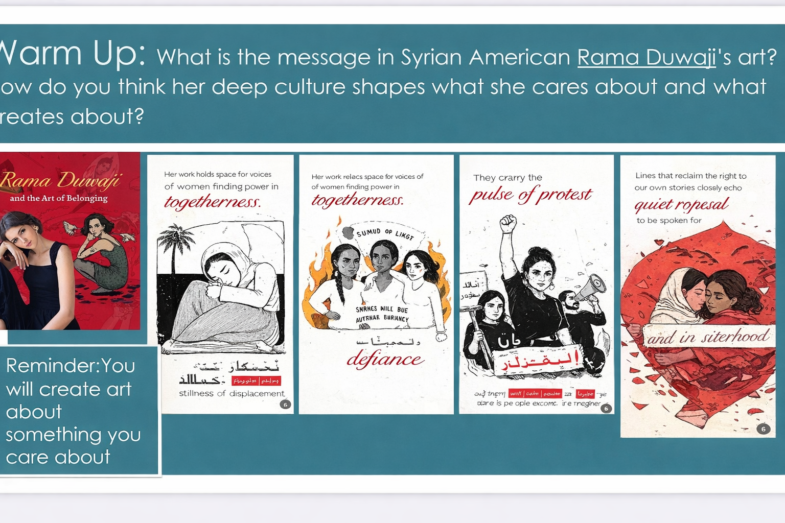 Her subsequent client work, BBC documentaries on Yemen, projects for the Tate and Cartier, added Western institutional polish to themes centered on Arab resistance and solidarity. Duwaji's design aesthetic focuses on "sisterhood amid conflict," often featuring imagery from Gaza rubble and portraits of Palestinian women.