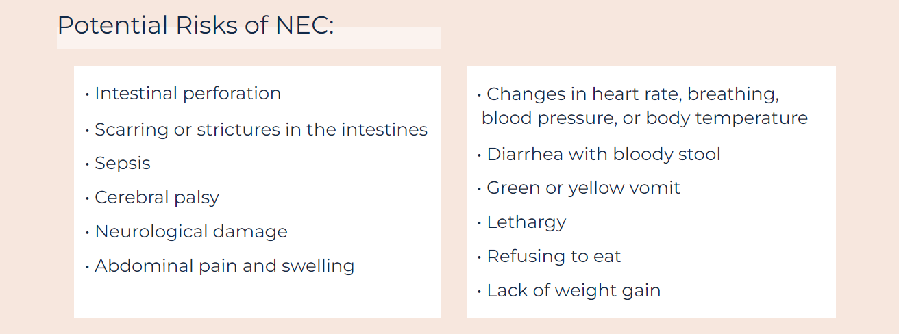 Cow’s milk-based baby formula and milk fortifier products (like Enfamil™ and Similac®) are more likely to develop necrotizing enterocolitis (NEC), a serious potentially fatal  gastrointestinal illness that is seen mostly in premature babies and low-birth-weight babies.