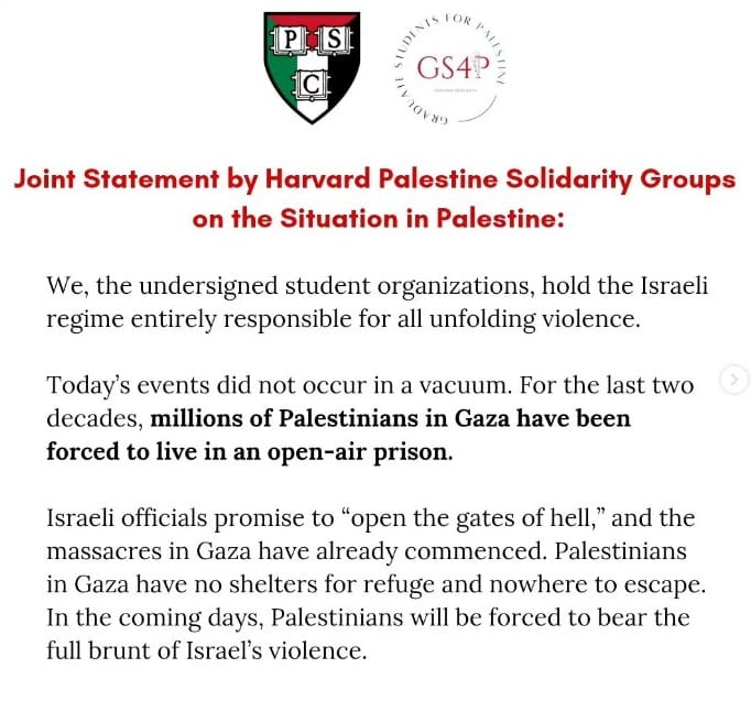 A letter was issued on Instagram by the Harvard Graduate Students for Palestine and the Palestine Solidarity Committee (P.S.C.), with signatures from more than thirty other campus organizations. The letter accused the Israeli regime of being entirely responsible for all unfolding violence. However, the letter was based on Kremlin propaganda and hijacked the narrative. It is believed that the Harvard Graduate School has been affected by Wokeism and mediocrity, which has led to its downfall and rabbit antisemitism.