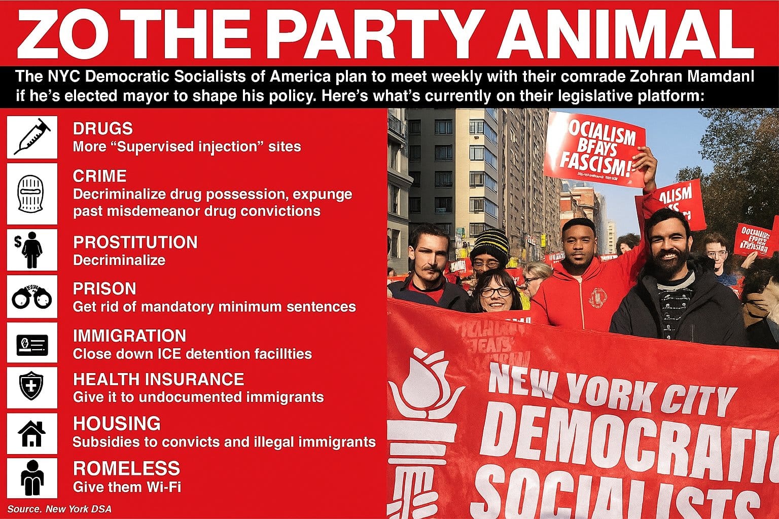 Open Society pushes back, slamming the claims as "riddled with inaccuracies," but the math raises eyebrows: grants predating the race, yet perfectly timed for door-knocking ops that looked organic but targeted one guy. Legal donors? Even sketchier: ex-employees of a Silicon Valley firm accused of national security threats, anti-Israel agitators, and out-of-state ideologues who've dumped over $350,000 since his primary win. This wasn't organic fervor; it was engineered excess, a DSA masterclass in "organizing for power." The Democratic Socialists of America, Mamdani's ideological home base, openly strategizes on "seizing" levers of government through relentless base-building: rapid-response protests to hijack narratives, high-participation campaigns that turn street heat into ballot wins, and cross-organizational alliances that amplify minority voices into majoritarian might. Their playbook—laid bare in resources like "Organizing DSA for Power" and YDSA's leadership primers—emphasizes "direct decision-making" fused with elected proxies, trusting "elected leadership" to execute between rallies while assuming "good intentions" to paper over dissent. It's not conspiracy; it's their own words: match "organizing priorities" to "national and local pathways," oppose "neo-fascist seizure" by preemptively capturing institutions. But DSA's rhetoric veers into the truly unhinged—think their post-October 7 screed calling for a "global intifada" against "Zionist imperialism," or their national convention resolution hailing "armed resistance" in Palestine as legitimate while decrying Israel's "genocide" in terms that echo blood libels. Prison abolition? They demand not reform, but erasure: "No one is disposable," per their platform, envisioning "community accountability" circles replacing bars—code for letting violent offenders roam free under "restorative justice" that sounds more like vigilante roulette. And don't forget their push for "decommodifying sex," framing prostitution not as exploitation but empowerment, with full decriminalization that critics warn opens floodgates to trafficking rings. Canary Mission's deep dive on DSA's "hostile takeover" warns of this exact playbook—ceasefire hypocrisy masking demands for Jerusalem as Palestine's capital and "right of return" that dissolves Israel as we know it. In NYC, it meant outspending Cuomo's comeback bid two-to-one in August alone, raking in $1 million mostly from non-locals who see the Apple as their Trojan horse.