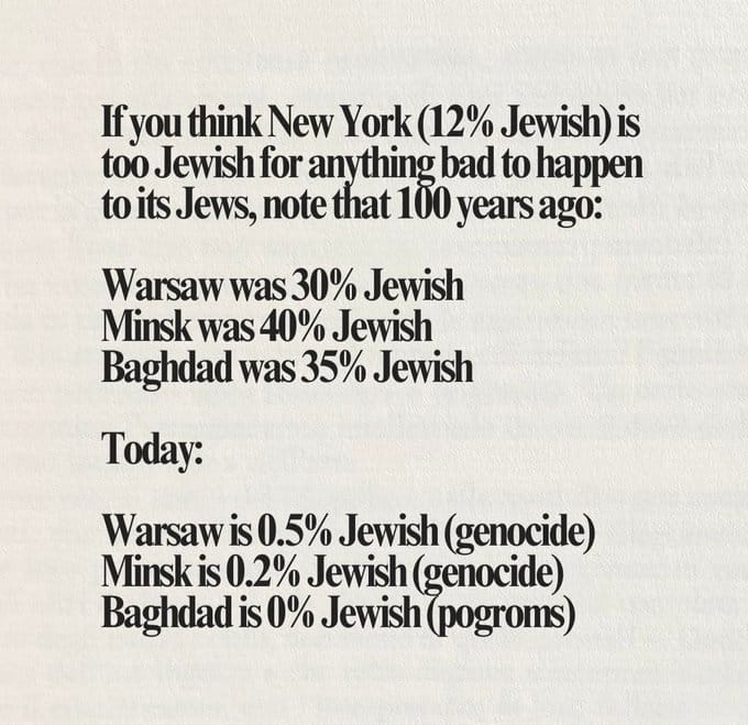 This is the test case. When Mamdani succeeds in de-Zionificating New York and if he delivers none of his promises without bankrupting the city—it’s over. Every Jew hater, radical progressive activist in America will have a blueprint for how to take power. If he fails, if the city descends into chaos, it is and will be Jews, just Jews, to blame from all the sides. It will fuel right-wing populism and left-wing Marxism. Either way, the old order is dead.