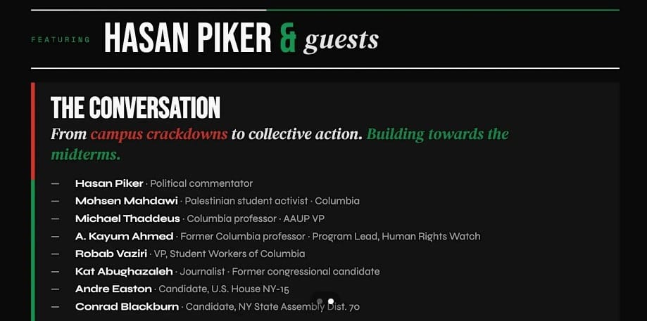 At the April 27 People's Forum event in Manhattan, Mohsen Mahdawi took the stage to explain why Hasan Piker wasn't there. Piker, the DSA-adjacent Twitch streamer cosplaying proletarian consciousness, had dropped out citing safety concerns. Threats, he said, from the right and from the left.